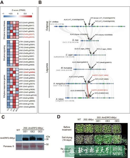 (A) PEG渗透胁迫下乙烯信号通路相关基因的表达水平;(B) 沙冬青AmERF2基因在豆科植物中的进化分析;(C) AmERF2在拟南芥中的过表达及验证;(D) 拟南芥AmERF2转基因植物的抗旱性检测。