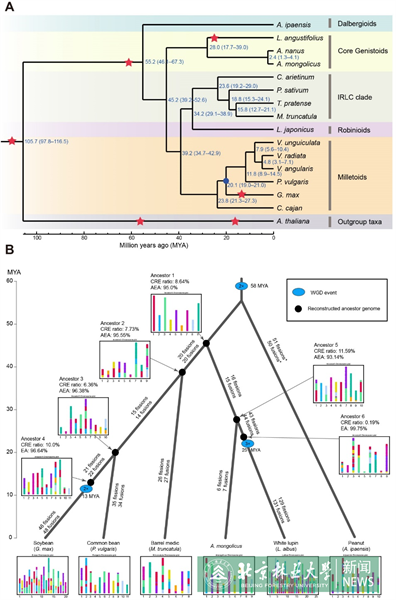 (A) 沙冬青与部分豆科植物的系统发生树,以及物种分化时间的推断;(B) 沙冬青与其他豆科植物的祖先染色体分析。