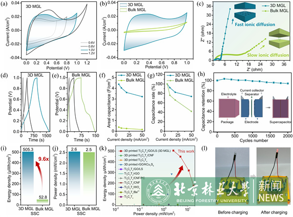 随着可再生能源和高效能量存储设备的需求急剧增加,超级电容器因其卓越的功率密度和快速充放电能力,正在成为下一个能源科技领域的焦点。超级电容器性能提升的关键在于电极材料的创新设计。材料学院许凤教授团队成功研发了一种全新的3D打印电极油墨配方,结合了木质素、MXene和氧化石墨烯,通过先进的3D打印技术,制造出具有垂直排列孔结构的厚电极。该技术不仅显著提升了电极的质量负载,还实现了突破性的面积比电容,达到8.6 F/cm²,超出传统厚电极近10倍!这种3D打印电极大幅提高了超级电容器的能量密度,为未来的高效能量存储提供了强有力的支持。