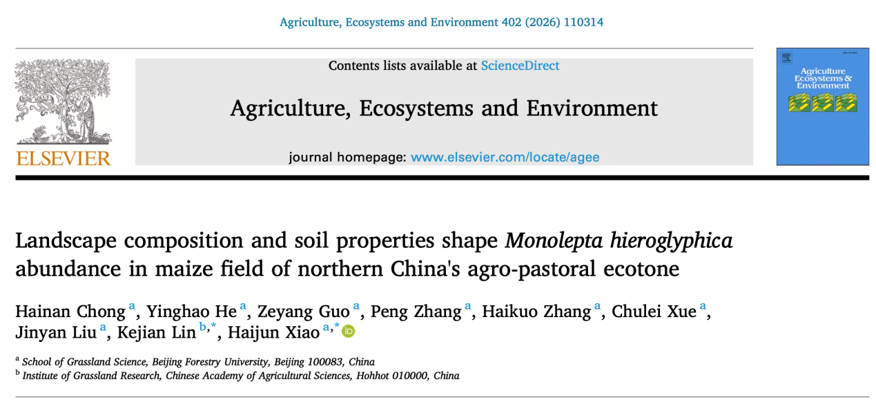 近日,草业与草原学院肖海军教授团队在农牧交错景观调节害虫种群研究取得新进展,相关成果以“Landscape composition and soil properties shape Monolepta hieroglyphica abundance in maize field of northern China's agro-pastoral ecotone”为题发表于《Agriculture, Ecosystems and Environment》。