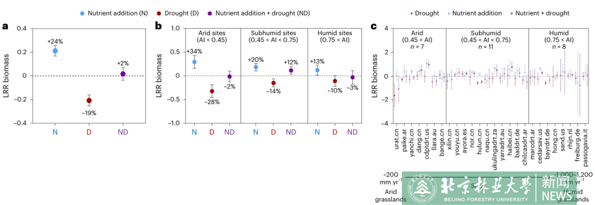 5月19日,草业与草原学院庾强教授以通讯作者身份,联合阿根廷布宜诺斯艾利斯大学、荷兰乌德勒支大学等10个国家42家单位的科研人员在《Nature Ecology & Evolution》上发表了最新研究成果“Aridity modulates grassland biomass responses to combined drought and nutrient addition”,探讨了草原生态系统生产力对干旱与养分添加及其交互作用的响应及其机制。