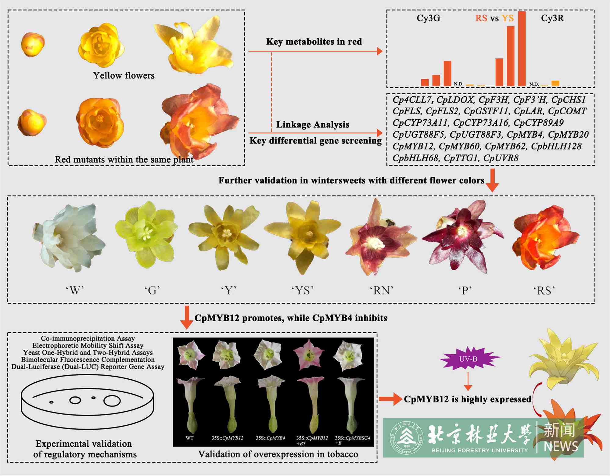 研究系统性揭示了色素代谢与基因表达之间的复杂映射关系:CpMYB12作为激活因子,通过与CpbHLH128和CpTTG1组建复合体,直接促进CHS、F3H、FLS与LDOX等关键基因的转录,从而驱动花色苷积累;而CpMYB4则作为拮抗因子,对同一通路实施抑制。进一步的跨物种功能验证与UV-B诱导实验表明,环境信号能够通过调控CpMYB12的表达水平,触发色素合成与花色加深。这一发现不仅阐明了蜡梅“由黄转红”的分子逻辑,也为观赏植物花色改良与环境适应性研究提供了全新思路。
