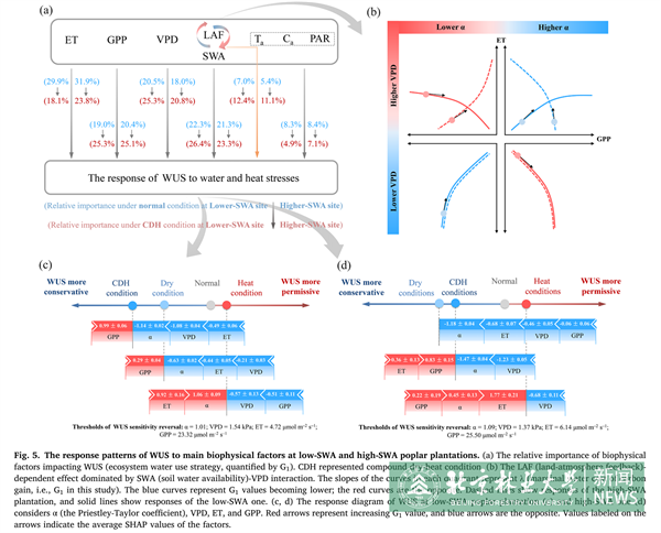 为此,本研究以中国北方常用人工林树种——欧美杨为研究对象,基于两个不同土壤水分条件杨树人工林的长期通量和微气象观测数据,深入探讨了生态系统水分条件在人工林应对干-热复合胁迫事件的介导作用。同时,利用多个机器学习算法和模型无关解释,揭示主要生物物理因素对生态系统水分利用策略的协同效应。