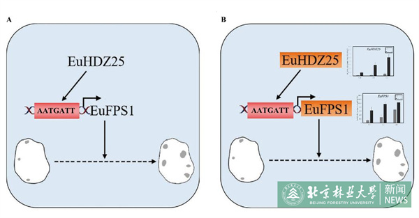 图1 :转录因子EuHDZ25调控杜仲胶合成(A) 及三倍体胶含量升高(B)分子模型