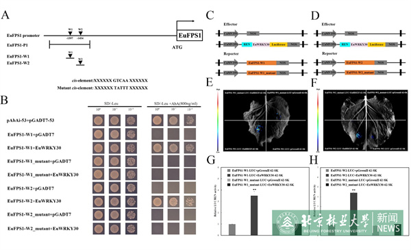 法尼基焦磷酸合酶(FPS1)是杜仲胶生物合成的关键酶,团队以EuFPS1的启动子为诱饵,利用酵母单杂交(Y1H)系统从杜仲cDNA文库中筛选出一个与杜仲胶合成相关的转录因子EuWRKY30。研究发现EuWRKY30与EuFPS1有相似的组织表达模式,进一步通过酵母单杂交和双荧光素酶报告基因检测实验证明,EuWRKY30直接与EuFPS1启动子中的W-Box元件结合,并激活其表达。且EuWRKY30过表达杜仲可显著增加EuFPS1的表达水平,进一步增加杜仲胶含量。证明转录因子EuWRKY30通过正调控杜仲胶生物合成关键基因EuFPS1的表达从而促进杜仲胶合成。杜仲三倍体叶片转录因子EuWRKY30显著上调表达,促进杜仲胶生物合成关键基因EuFPS1表达,也是杜仲胶含量提高的重要分子机制之一。研究结果为深入解析杜仲胶生物合成的转录调控机制以及进一步开展分子设计育种提供了理论基础。