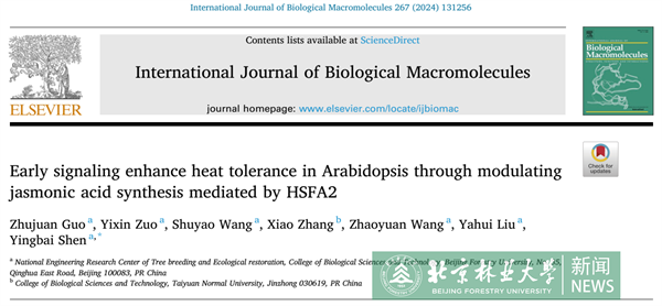 近日,生物科学与技术学院沈应柏教授团队在International Journal of Biological Macromolecules(一区,TOP期刊,IF=8.2)上发表了题为“Early signaling enhance heat tolerance in Arabidopsis through modulating jasmonic acid synthesis mediated by HSFA2”的研究论文。